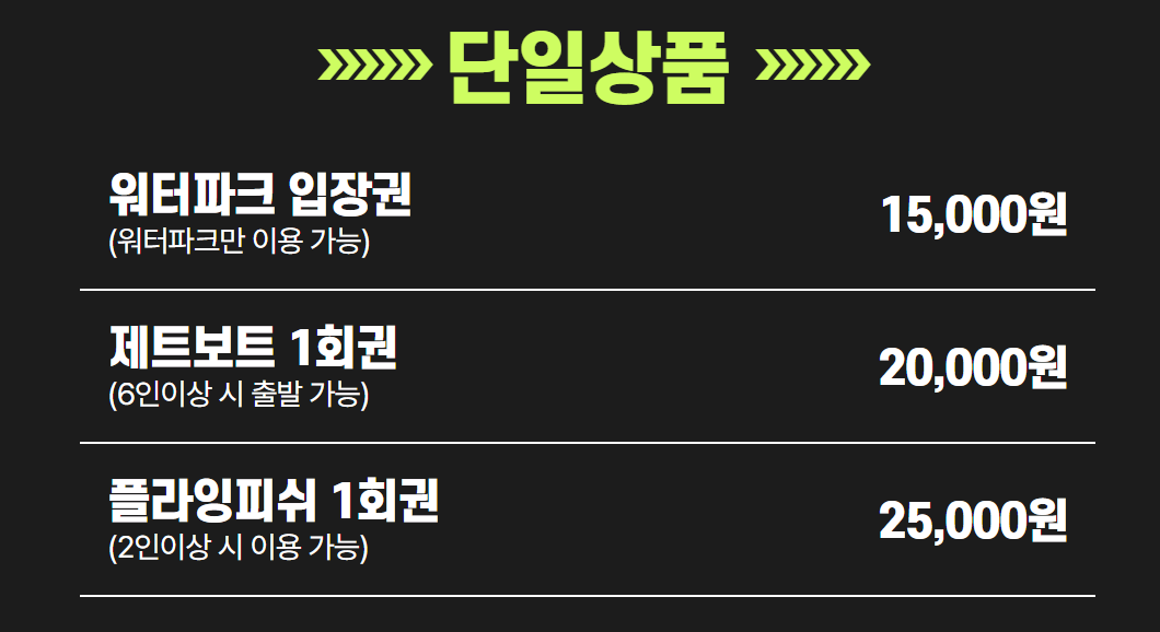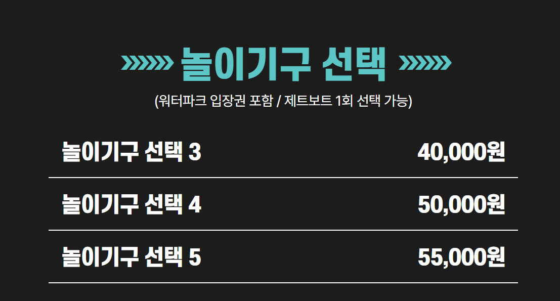 | 놀이기구 3개(4인) | 159,600원 | 120,000원(일~금) / 140,000원(토) | 120,000원 |