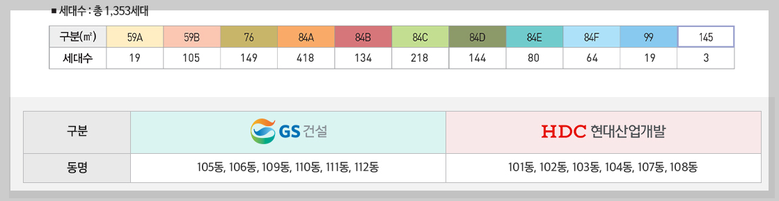 대전 둔산자이 아이파크의 경우 GS건설(105동, 106동, 109동, 110동, 111동, 112동)과, HDC현대산업개발(101동, 102동, 103동, 104동, 107동, 108동)이 공동으로 지었으며 총 12동입니다. 전세대가 남향을 위주이며, 남동향과 남서향입니다.