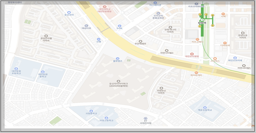 신도시나 새롭게 형성된 택지같은 경우는 생활인프라가 부족한 경우가 많습니다. 하지만 둔산과 탄방의 경우 오래전부터 생긴 많은 생활시설(약국, 병원, 마트, 편의점, 카페, 학원 등)이 있어 편안한 생활이 가능 할 것입니다.
