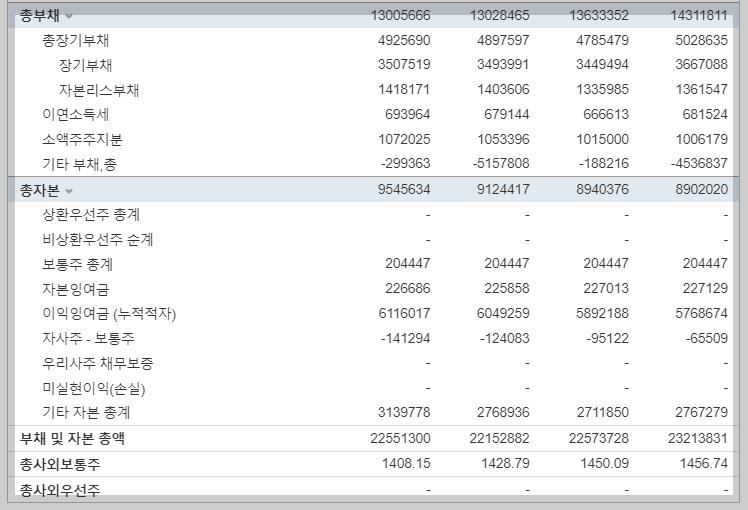 - 총 부채비율이 78.92%로 조금은 높은 편이지만 시간이 지날수록 현금이 증가하고 있으며 총자산 또한 증가하고 있습니다. 늘어난 자산으로 기업에 대한 투자 및 영업활동 등 지속적으로 발전해 간다면 좋을 것으로 보입니다.
