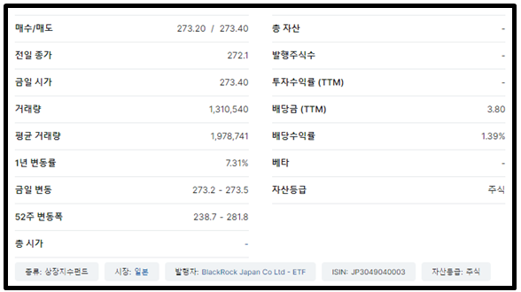 이 종목의 자산 운용사는 미국의 유명한 투자회사인 블랙록입니다. 블랙록은 엔화 대비 미국 달러의 가치의 변동에 노출되지 않도록 조치를 취하면서 동시에 S&P 500 지수에 포함된 미국 대표 기업 500개의 주식을 추종합니다. 발행당시 블랙록의 기금 순 자산은 52,923,111,051엔(2020년 6월 상장)으로 한국돈으로 약 5천억에 해당하는 규모입니다. 그리고 현재는 시가총액은 61,079,324,000엔으로 약 5,336억원이고 발행주식 수는 223,570,000,000주가 됩니다.