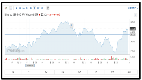 이 글을 작성하는 기준(11월 25일)으로 ishare S&P 500 JPY HEDGED ETF의 주당 가격은 273.2엔입니다. 해당 1주당 가격은 엔화대비해서 약 2,400원(2,386.78원)이지만 일본주식의 경우 10주씩 매수가 가능합니다. 따라서 10주를 매수를 하려면 약 24,000원이 필요한 셈입니다.