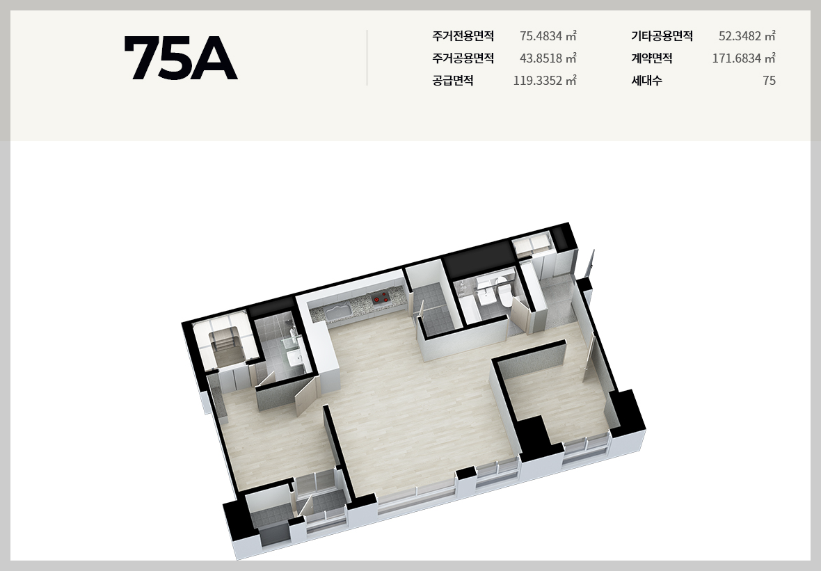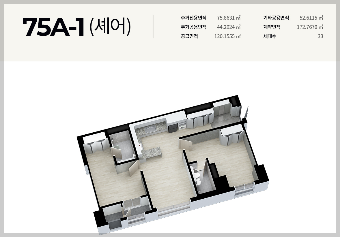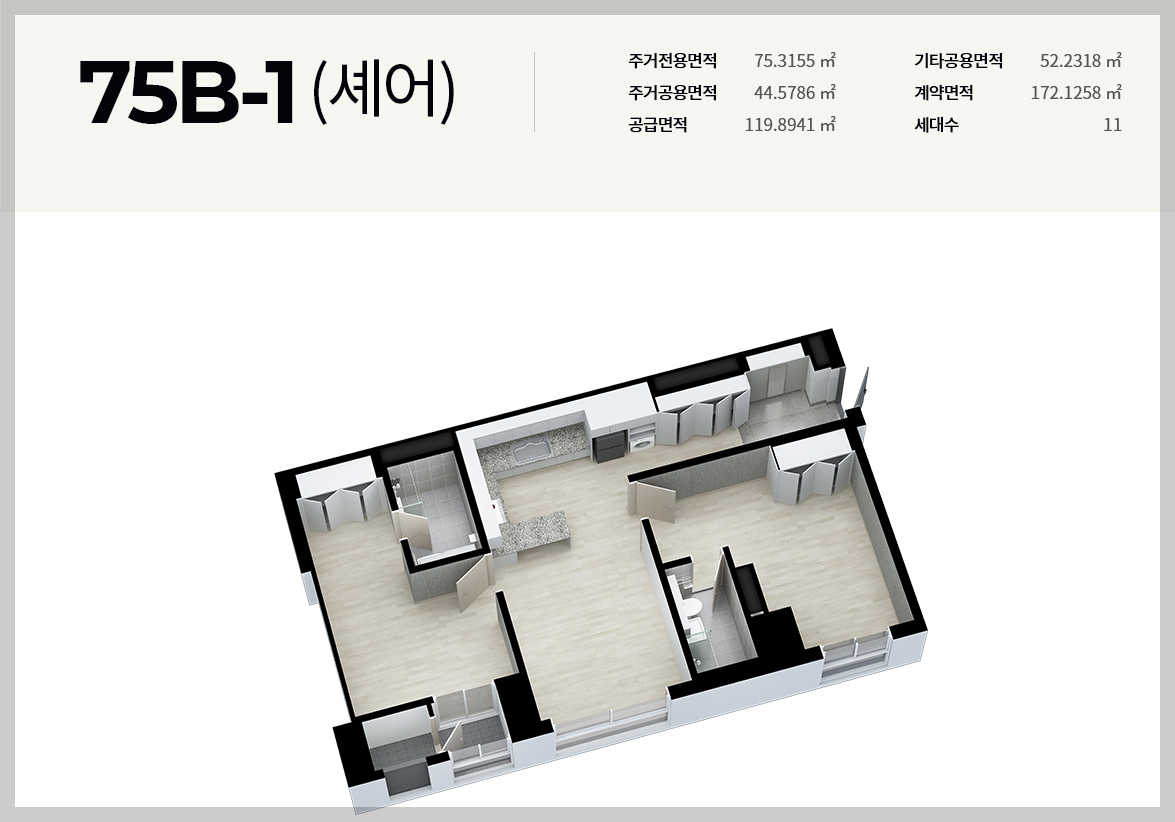 이랜드 피어 둔산의 경우 다양한 평면타입이 있습니다. 총 8가지(75-A[셰어] / 75-B[셰어], 75A, 75B, 84A, 84B, 84C, 84D)로써 특징적인 부분은 셰어타입은 화장실이 모두 방안에 있다는 점입니다.
