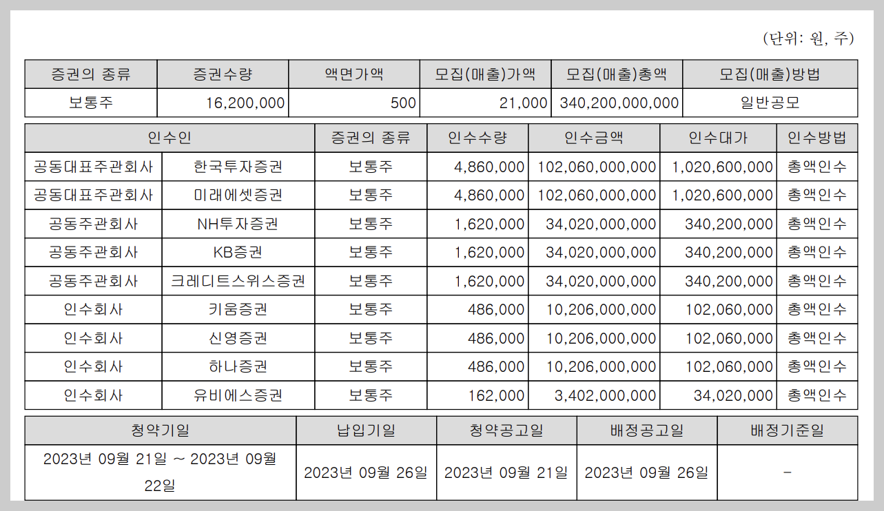 - 상장주선인(증권사) : 한국투자증권, 미래에셋증권, KB증권, NH투자증권, CS증권