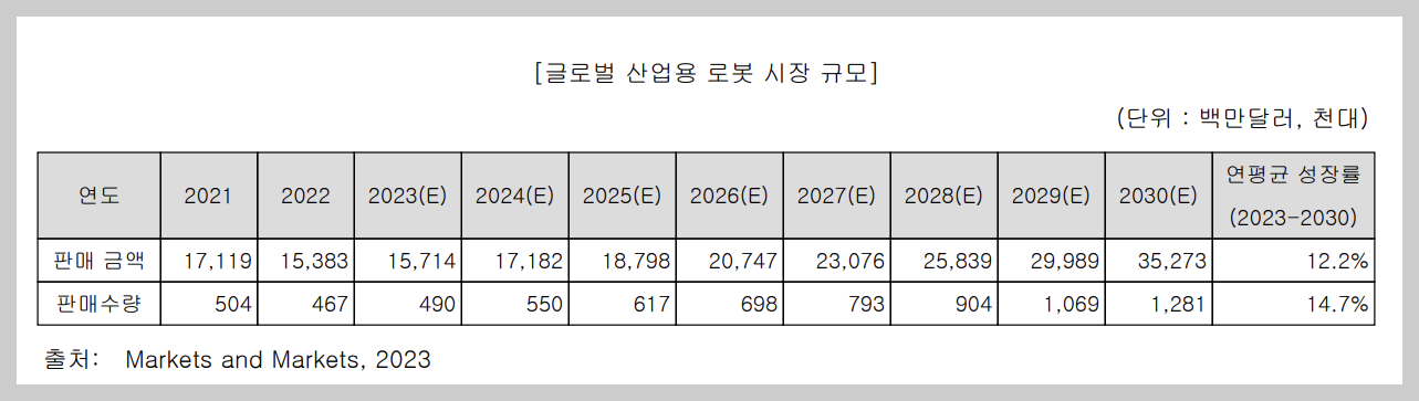 협동 로봇 시장은 현재 초기단계이지만, 제조산업뿐 아니라 성장률이 상대적으로 높은 서비스 산업에서도 활용이 가능하여 더욱 높은 성장률을 나타낼 것으로 예상이 되며, 설치대수 기준으로 2023년에서 2030년까지 연평균 33.4% 수준의 성장이 이루어질 것으로 예상됩니다.