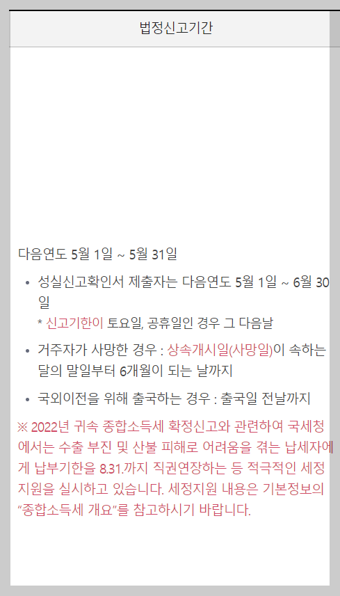 또한, 국세청에서는 특정 상황에서 납세자에게 세정지원을 제공하고 있습니다. 예를 들어, 2022년 귀속 종합소득세 확정신고와 관련하여, 수출 부진이나 산불 피해로 어려움을 겪는 납세자에게는 납부기한을 8월 31일까지 직권연장하는 등의 지원을 제공하고 있습니다. 세정지원의 자세한 내용은 '종합소득세 개요'를 참고하시기 바랍니다.