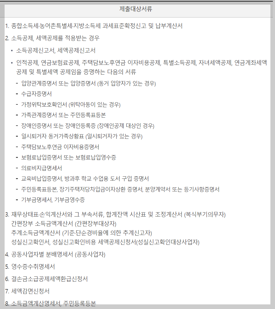 - 인적공제, 연금보험료 공제, 주택담보노후연금 이자비용공제, 특별소득공제, 자녀세액공제, 연금계좌세액공제 및 특별세액 공제임을 증명하는 다음의 서류