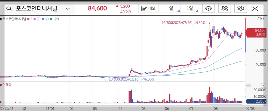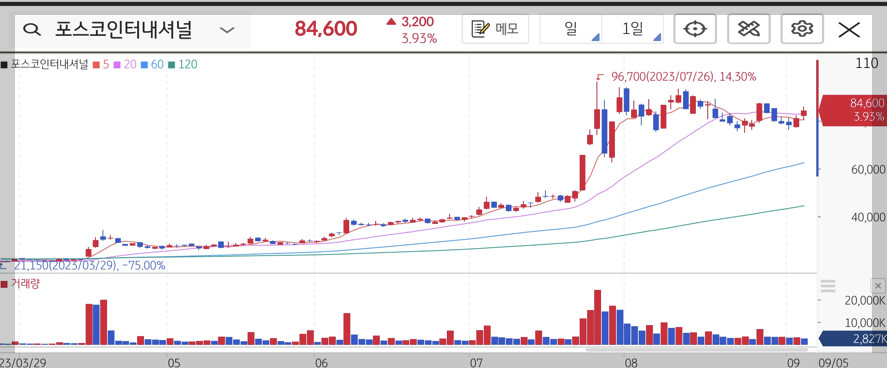 안녕하세요. 부자되고 싶은 은성입니다. 오늘 주식관련 포스팅은 최근 큰 상승을 보여주고 있는 포스코 DX입니다. 전체적으로 2차전지 종목이 하락하는 분위기 가운데 혼자 독주하고 있는 포스