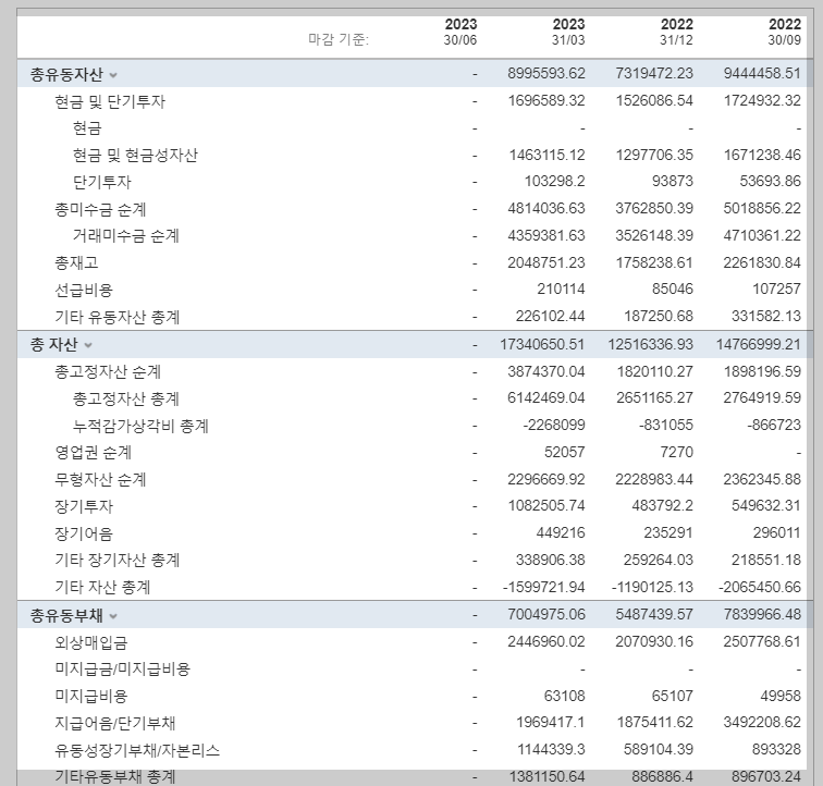 - 총 유동자산을 보게 되면 22년에 비해서 23년에 올수록 유동자산이 증가하고 있습니다. 그만큼 매출이 점차 증가했기 때문이 아닌가 싶습니다. 그에 따라서 총 자산도 증가했음을 알 수 있습니다.