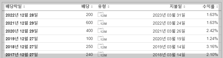 - 배당은 연말에 1번씩 나오는 연배당입니다. 배당률은 약 1.5%정도로 크게 높진 않습니다. 또한 배당성장률 자체도 높지 않아보이며 배당이 오를때도 있고 내릴때도 있습니다. 이런경우는 배당으로 투자를 하기보다는 주가의 상승을 노리는것이 좋습니다. 개인적으로는 배당으로써는 매력이 떨어진다고 볼 수 있습니다.