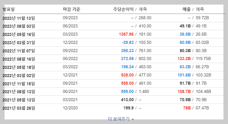 - 다음 실적발표는 11월 13일입니다. 5월달 실적발표에서 주당 순이익이 크게 증가했기때문에 기대가 되는 부분입니다.