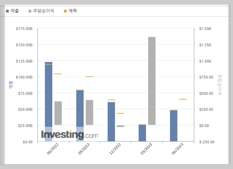 - 위에 있는 사진은 인베스팅 닷컴에 있는 사진으로 23년 1분기를 보게 되면 동기 대비 매출액은 약 58%정도 감소했고 영업이익은 90%감소를 하였습니다. 하지만 당기순이익은 578%이상 크게 증가했습니다. 조금 신기한 부분인데요. 아마도 자재원가측면에서 크게 절감을 한게 아닌가 싶습니다.