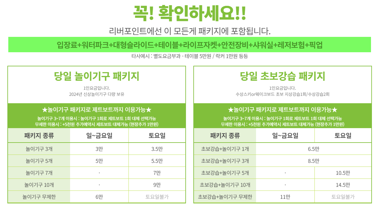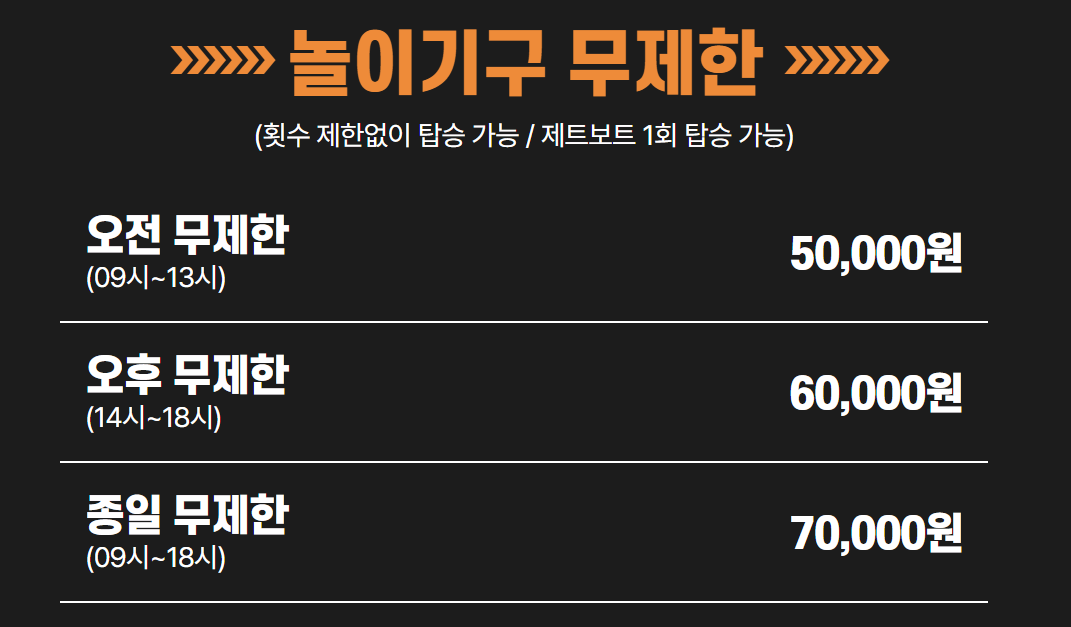 | 놀이기구 3개(4인) | 159,600원 | 120,000원(일~금) / 140,000원(토) | 120,000원 |