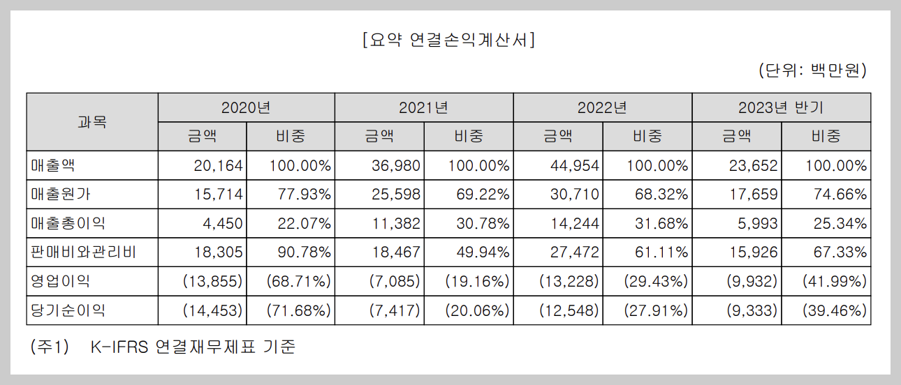 수익성 측면에서는 현재 영업손실을 기록하고 있지만, 2018년부터 2021년까지 꾸준한 매출 성장세를 유지하면서 손실율이 개선되는 모습을 보이고 있습니다. 다만, 2022년에는 매출 증가율이 소폭 둔화가 되었지만, 이 후에 해외 마케팅 확대 및 개발 활동을 실시하고 있습니다.