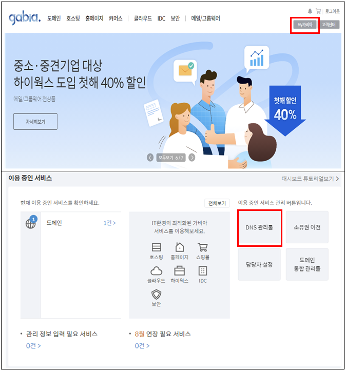 1. 기존에 먼저 가비아에서 도메인을 구매하셨을거에요. 아니라면 아래 링크를 확인해 주세요.