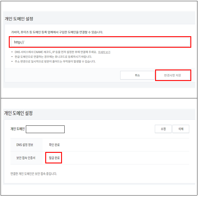 6. 하위도메인(ex : 12.abc.com) 주소를 넣어주시고 변경사항을 저장해줍니다. 그 후에 보안접속인증서가 발급완료가 될때까지 기다려주시면 됩니다.